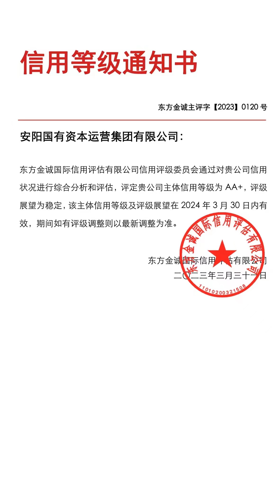 2023年4月7日,經(jīng)國(guó)內(nèi)權(quán)威信用評(píng)級(jí)機(jī)構(gòu)——東方金誠(chéng)國(guó)際信用評(píng)估有限公司出具正式報(bào)告,評(píng)定安陽(yáng)國(guó)有資本運(yùn)營(yíng)集團(tuán)有限公司(下稱安陽(yáng)國(guó)資集團(tuán))主體信用等級(jí)為“AA+”,評(píng)級(jí)展望為“穩(wěn)定”,安陽(yáng)國(guó)資集團(tuán)成為我市首家主體信用為“AA+”的企業(yè),實(shí)現(xiàn)了我市國(guó)有企業(yè)增信提級(jí)的重大突破。